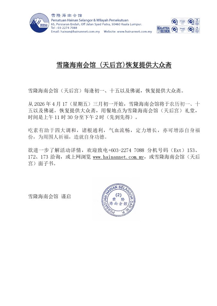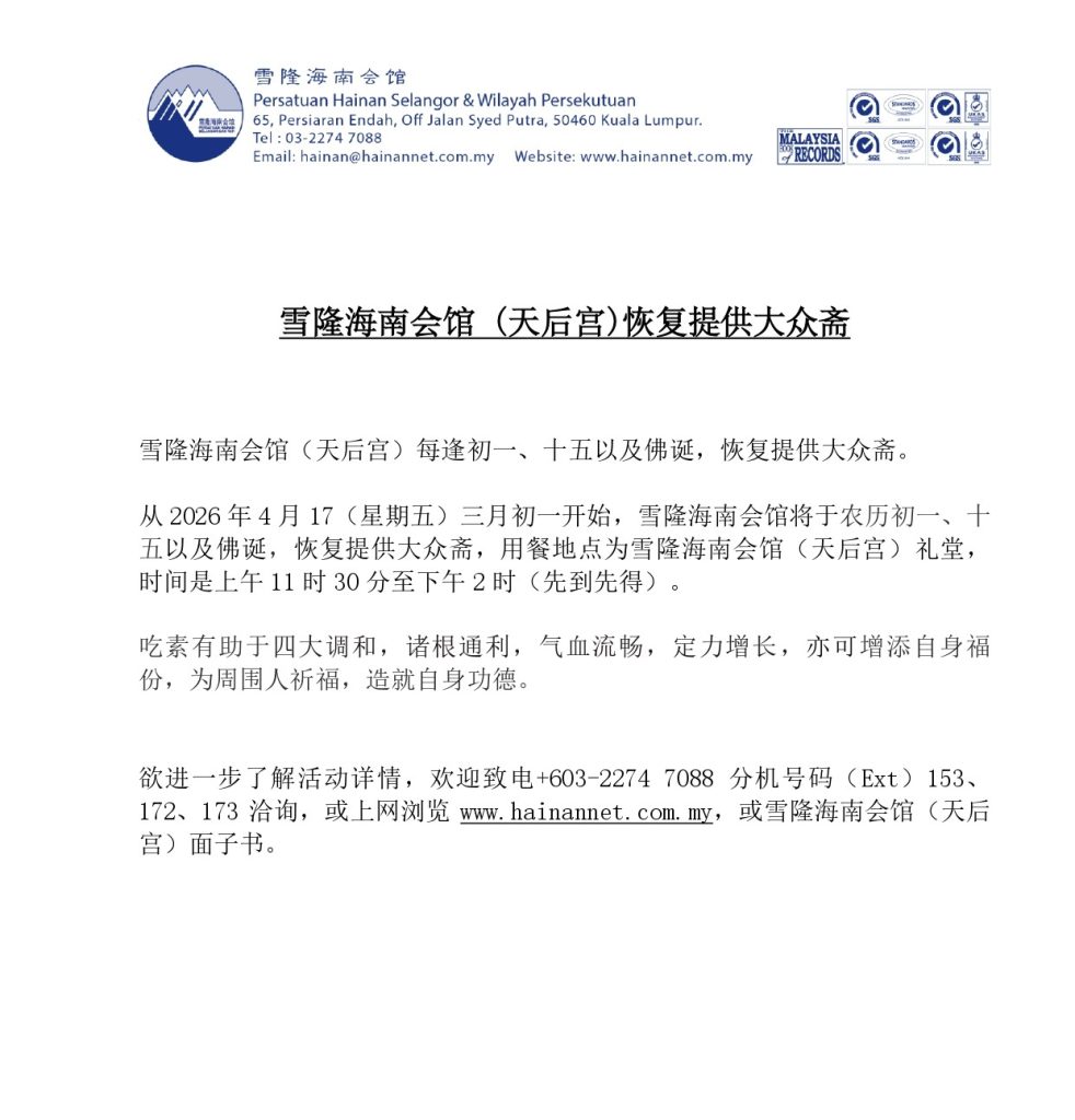 雪隆海南会馆 (天后宫)恢复提供大众斋