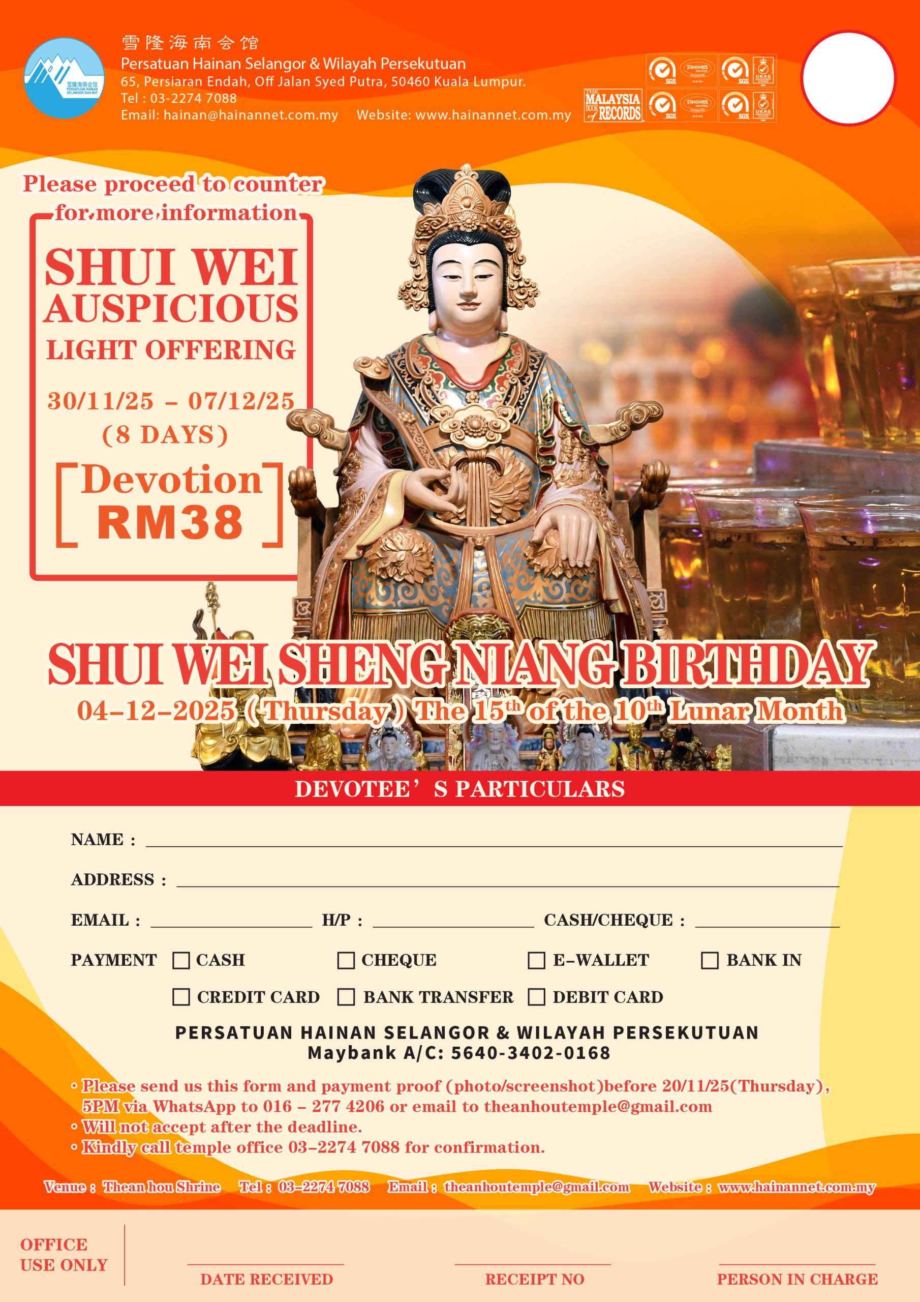 In conjunction with Shui Wei Sheng Niang Birthday on 4th December 2025 (Thursday,15th Day of the 10th Lunar Month), we organized Shui Wei Auspicious light from 30th November 2025 till 7th December 2025. Light offering RM38.